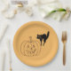 Jack-o-lantern pumpkin is smiling up at a startled black cat. Background is orange.