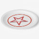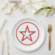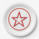 Red star in three dimensions, sits in center of plate. Star has a light red circle nestled within, and darker red circle runs around the outer edge of plate.