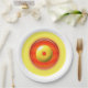 Four Circles are centred over a white background. Central red orb is smallest, the next is a solid yellow 3d circle, next is a larger translucent looking red ball. Next is largest coloured ring of yellow, banded by the white background. Image gives illusion of balls rising or descending from view.