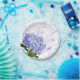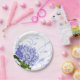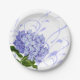Party paper plates shown in the white dessert size with a art print of a lovely single blue hydrangea design.