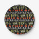 paper plates printed with a repeating pattern of roller derby legs in black and yellow striped tights, red roller skates, and skull and crossbones (with some killer bees in between)