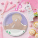 These paper plates are designed with a paper art depiction of a whimsical mountain in front of a full moon in a lavender sky.