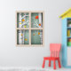 Papercut-look window with Aspen trees and falling autumn leaves.