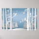Striking papercut design in blue and white with trees, squirrels, and snowflakes.