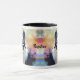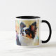 This colourful mug celebrates the adorable and energetic Papillon dog! Two sides of the mug have a beautiful portrait of a Papillon Dog against an abstract background. Predominant colours are blue, pink, gold and more. At the centre is script that says Papillon, but you may change it or even personalise it, if you wish. This mug will get noticed!