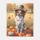 A watercolor-style painting of a cheerful dog sitting amidst a pile of vibrant fall leaves, surrounded by tiny pumpkins and scattered acorns. The dog wears a little pilgrim hat and beams with joy, capturing the spirit of Thanksgiving. In the background, soft harvest fields and golden-hued trees create a peaceful countryside ambiance. Gentle textures and warm, muted autumn tones give the scene a cosy, nostalgic feel perfect for celebrating the beauty of the season.