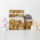 Yellow and green parakeet or budgie peeks out from a broken Christmas ornament surrounded by gold holiday garland bird lovers Christmas holiday wrapping paper