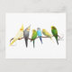 A group of cute little parakeets and cockatiels, sitting on a perch :)