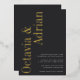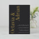 A modern and minimal typography based wedding invitation featuring your names in gold foil serif lettering on a soft black background, running vertically up the left side of the card. Personalise with your wedding details aligned at the lower right.