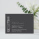 A petite wedding invitation enclosure card for your reception details, with "Reception" along the left side in classic white lettering, and your reception details aligned at the lower left. Designed to match our Parallel wedding collection. Our Ash colorway makes a classic statement with crisp white lettering on a soft black background.