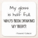 Funny and quirky slogan beer mats with text "My glass is half full. Who's been drinking my beer?!" quoted paranoid optimist.