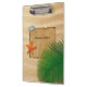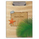 Old parchment paper with palm leaf, stone and starfish on beach sand background.