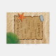 Old parchment paper with palm leaf, stone and starfish on beach sand background.