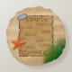 Old parchment paper with palm leaf, stone and starfish on beach sand background.