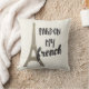Hip throw pillow with "Pardon my French," written with calligraphy and handwritten fonts over an image of the Eiffel tower.
