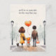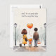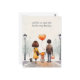 A cute back-to-school postcard with an illustration of a cute schoolgirl holding hands with his parents and with the default customisable text "we'll be on your side for the very first day!" text. There is also a puppy accompanying the family.