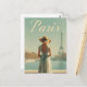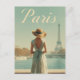 This elegant vintage poster captures a romantic Parisian moment: a woman in a flowing 1950s dress stands gracefully by the Seine River, gazing towards the Eiffel Tower. The scene is bathed in warm, nostalgic tones, with soft reflections on the water and classic Parisian architecture in the background. The artwork evokes the timeless charm of mid-century Paris, combining vintage fashion with iconic landmarks. A perfect piece for lovers of retro elegance, Paris, and classic travel art.