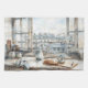 This Paris apartment kitchen watercolor features a light-filled interior with a simple countertop, ceramic teapot and cup, fresh baguette on a cutting board, and a softly folded striped tea towel. Through tall windows, classic Parisian rooftops create an elegant backdrop, while muted neutrals and soft blues give the scene a calm, timeless feel perfect for kitchen décor and tea towels.