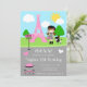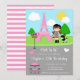 This cute and fun invitation features a brunette hair girl with a poodle. In the background is the Eiffel Tower, sunshine, clouds and trees. There is a sign post and a table with chairs to fit the Paris theme. The text combines decorative and serif fonts for a stylish and modern look. This is perfect for a Paris themed birthday party.
