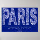 Modern horizontal blueprint-style poster featuring the word “Paris” filled with a detailed city street map. Clean white lines on a deep blue background create a technical, architectural look inspired by classic blueprints. A striking piece of wall art for modern interiors, studios, offices, and design-focused spaces.