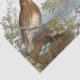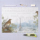 Two thrush birds watch over a nest of blue eggs with the Eiffel Tower and city of Paris in the background. The sky is filled with vintage text of French cities and addresses. Great for decoupage projects.