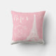 This chic pink pillow features a white Eiffel Tower graphic with "Paris" written in modern script. A monogram initial for you to personalise is framed by a white fancy scroll.