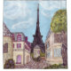 This landscape cityscape painting is art by Kristie Hubler, inspired by old photography of the Eiffel Tower, Paris, France, and the indoor shop facades of Paris Las Vegas, in the impressionism technique, with the art's round tower & Mansard roof building on the left side, and the right side with the twisted French oak tree on the right.
