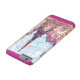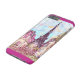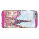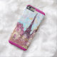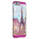 Paris Eiffel Tower pointillism iPhone 6 case, art created by Kristie Hubler, inspired by Paris, France, the Eiffel Tower, and the shop facades inside Paris Las Vegas resort and casino. Also inspired by artist George Seurat. Has a berry coloured orchid fuschia top and bottom borders.