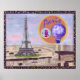 This cityscape painting on this poster was inspired by Paris, France and features the Eiffel Tower, a pink poodle, the word "Paris", and a hot air balloon, by Kristie Hubler