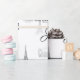 The Eiffel Tower, the words "Joyeux Noël" (Merry Christmas in French), Paris in vintage typography, and vintage French labels for champagne and cocoa and sprigs of vintage holly in black on white make a lovely and interesting Christmas gift wrapping paper