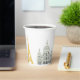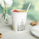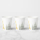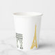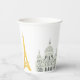 Party cups featuring famous Paris landmarks. The Eiffel Tower, Sacre Coeur, Arc de Triomphe, and Notre Dame. White cup with great art depicting these iconic structures.