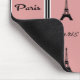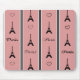 Paris illustration with Eiffel Tower and heart decoration and Paris text design on black, white and pink striped background