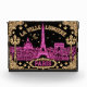 Paris rendered in electric rose pink and warm champagne gold neon — the Eiffel Tower and full cityscape in rose pink, ornate Parisian street lamps and La Ville Lumière arch text in champagne gold. The romantic dual neon palette glows beautifully through the clear acrylic.