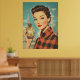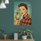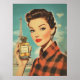 A glamourous 1950s vintage poster featuring a sophisticated woman in red plaid holding a luxurious perfume bottle labelled “PARFUM.” The Eiffel Tower rises in the background, enhancing the chic Parisian aesthetic with bold colours, retro fashion, and classic beauty.