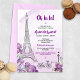 Bonjour and welcome your guests with a purple watercolor invitation perfect for a Paris themed bridal shower. The Eiffel Tower is surrounded by lovely purple irises with a Parisian skyline silhouette in the background. Available with matching products.