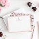 Our chic Parisian inspired personalised stationery flat cards feature a pastel blush pink border, a tiny black Eiffel tower illustration, and your name, monogram or choice of personalisation. Cards reverse to our Paris Romance pattern, with tiny birds, croissants, macarons, roses, coffee cups, and the Eiffel tower on a pale blush pink background.