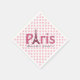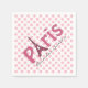 Paris themed Sweet 16 birthday party paper napkins, with graphics of a pink polka dot background and pink graphic text reading Paris, with the letter a done like the Eiffel Tower. Personalise the black script text for your daughter's special day. Matching products available.