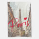 This kitchen towel uses a watercolor sketch painting of the iconic Eiffel Tower as seen through a side street - evoking memories of travels in Paris and French street life! The word “Paris” in bright red with a heart adds a stylish and modern touch - you can easily re-size, delete, change the colour of or move this text around if desired.