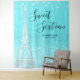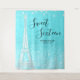 A chic teal Paris themed sweet 16 backdrop tapestry. Design features an Eiffel tower illustration, string lights and modern calligraphy font.