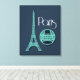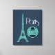 This art features a design of the Eiffel Tower in teal on a dark blue background.