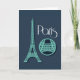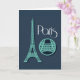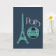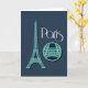 This art features a design of the Eiffel Tower in teal on a dark blue background.