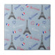 Seamless Paris text design illustration with Eiffel Tower, tricolor heart shapes and French flag decoration on blue background for Valentine's Day