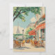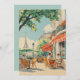 A charming vintage-style illustration of a sunny Paris café terrace with rattan chairs, red-striped awnings, and views of the Eiffel Tower. The 1950s retro aesthetic and warm ambiance make it a perfect piece for nostalgic or travel-themed decor.