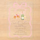 Parisian croissant with pink bow, champagne glass, and bottle on pink background. These birthday invitations are easily customized for your event by simply adding your details.