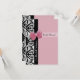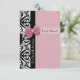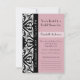 A portrait style 3.5" x 5" elegant pink and black Parisian style invitation with trendy black and white damask and a chic pink ribbon wrapped around a feminine pink lace background. Personalise to invite your guests to attend.