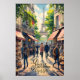 A bustling Parisian street scene with the Eiffel Tower in the background. People stroll along the sidewalk, past shops and cafes, enjoying a sunny day.