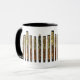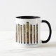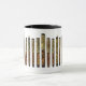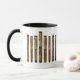 A seven pen grouping of Parker Duofold Deluxe pens, including, from the left most pen, flat top Lady ringtop c. 1928-29, flat top Juniorette c. 1928-29, flat top Junior c. 1928-29, streamline Senior c. 1930-33, streamline Junior c. 1930-33, streamline Juniorette c. 1930-33, and streamline Lady ringtop c. 1930-33. They repeat around the mug. Go De Luxe with your coffee!