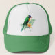 Cute colorful parrot and orange flowers with green leaves. Customizable hat template
