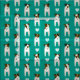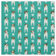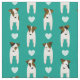 This Jack Russell Terriers fabric features a staggered, columnar pattern of eight illustrated JRTs alternated with white hearts - the dogs have varying brown and black head and body markings and each is displaying an irresistible doggy head tilt - customisable background is blue green - Jack Russell Terriers pattern © katz_d_zynes 2019