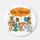 Party Animals 3rd Birthday tshirts, magnets, cards, stickers, tote bags, and more featurning a racoon, elephant, monkey, dino, dog, and bear with gifts, candles, party hats, and confetti. Text reads "I'm Three!".